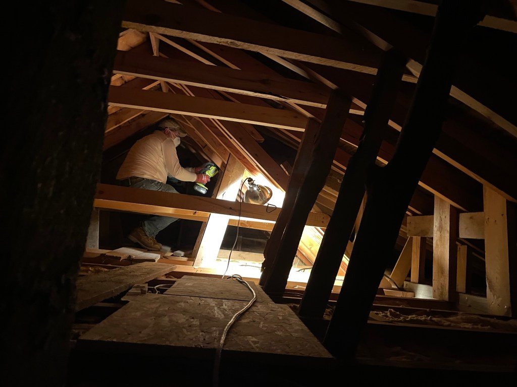 To minimize how many walls had to be opened (and then repaired) wire was run from the breaker box in the basement up the walls to the small closet off the south bedroom, which simply had plywood over the studs. From this closet the wires were then run up into the attic and then disburst to the rooms on the second floor. Toward the edges of the attic it got pretty tight, and Brandon was a huge help, being younger and smaller.
