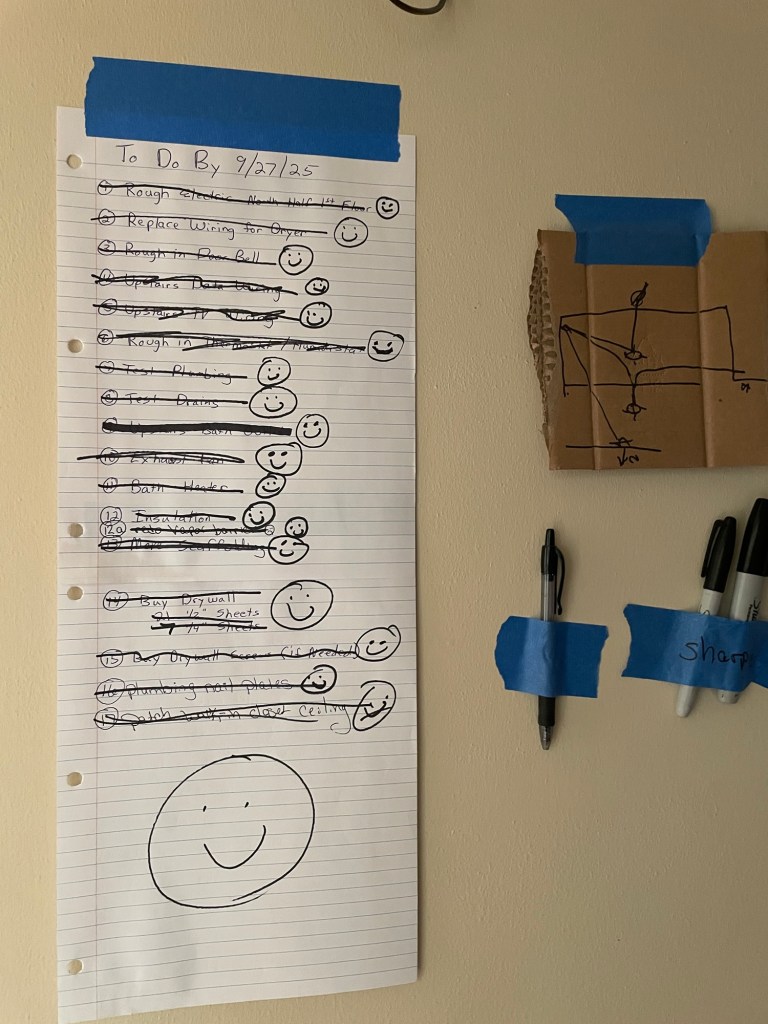 Back to the open walls of the closets and new bathroom. We had a punch list taped to the wall listing what we needed to complete by the end of September, when the drywall crew would arrive.