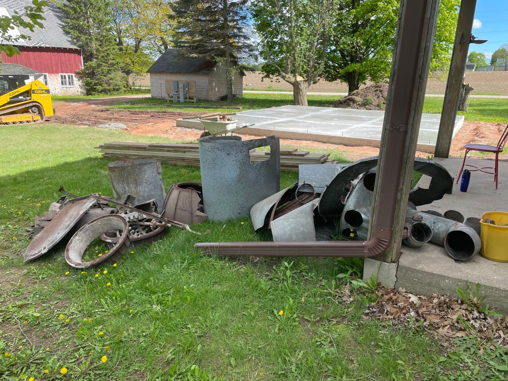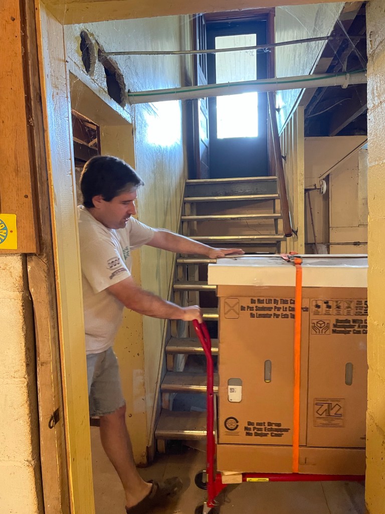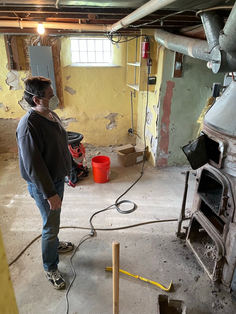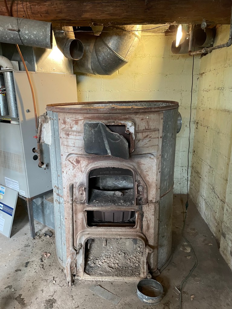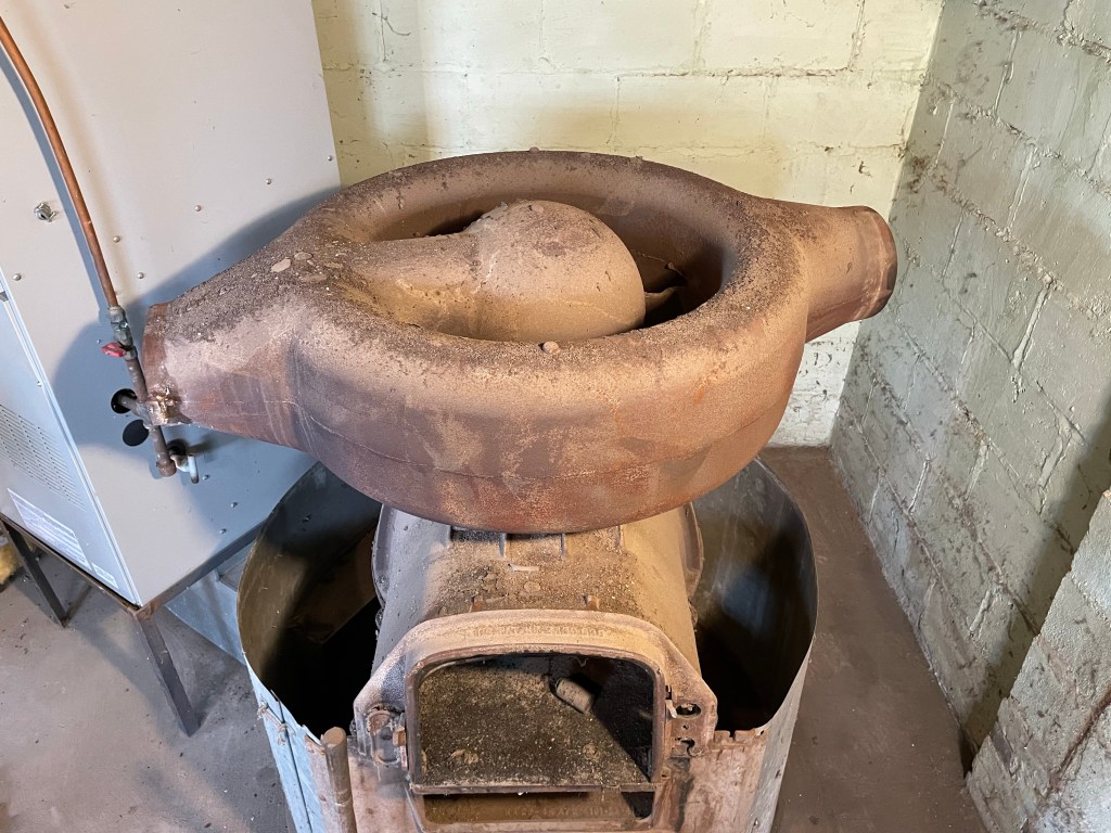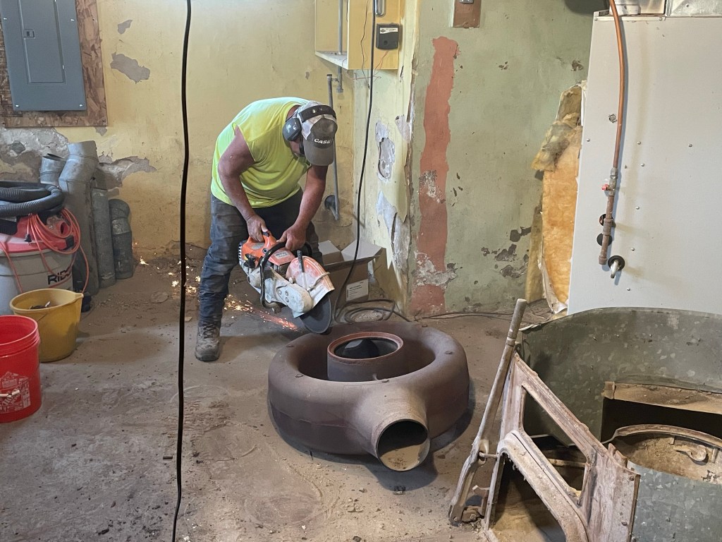 The beast has a cast-iron heat exchange. With a flight of stairs to deal with there was only 1 way it was coming out. In pieces. Brad took a sledge hammer and broke the cast-iron into manageable pieces hauling it and the sheet-metal up the steps.