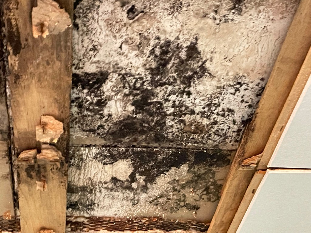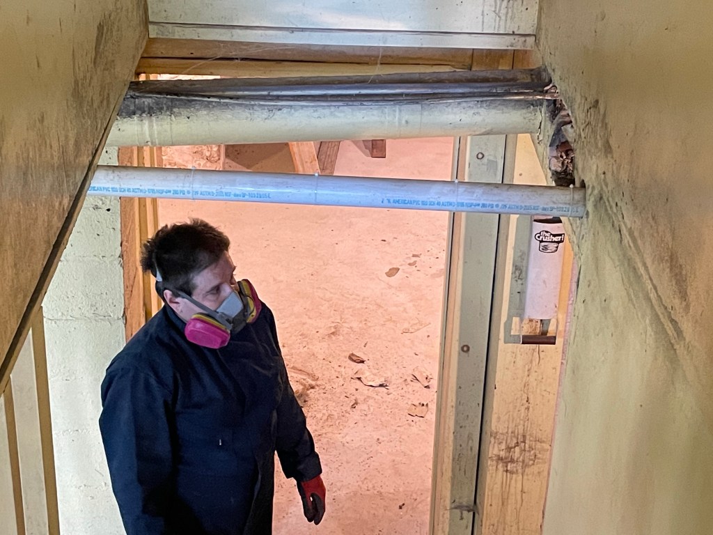 The first thing we did was to assess how the plumbing and heating got upstairs since we were changing the wall that the heat duct ran through. To do this we had to take down the ceiling. Well – not the whole ceiling. Those staple up recycled paper ceiling tiles were in this room. We suspected that the toilet in the 2nd floor bath had leaked or sweated due to a water spot on the ceiling. So the first order of business was to take those ceiling tiles down. That was a me job. I have one word for what I found – GROSS.