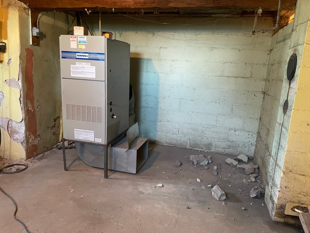 The last post I had was bringing the new furnace down stairs and removing the beast and the propane furnace that had fed into it. If you haven’t read the other posts, you read that right. The modern heating system that we bought the house with was a downflow furnace up on a stand being fed into an old coal burning furnace that was acting as a huge, super inefficient plenum.