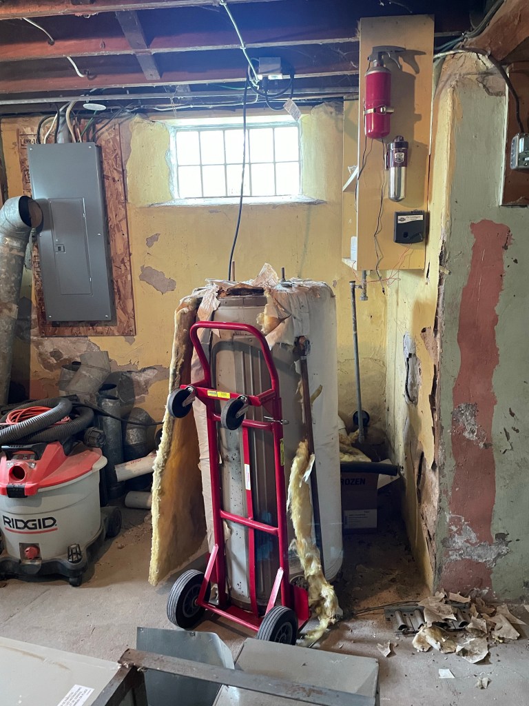 Then there was the old propane furnace. Brandon helped Brad carry that up and out – a much simpler job. While they were at it they hauled the old electric water heater out too. Under the water heater blanket we found that it had scorching from something not good electrical at one point. To prep the area for the new furnace they got everything out of the “cubby”
