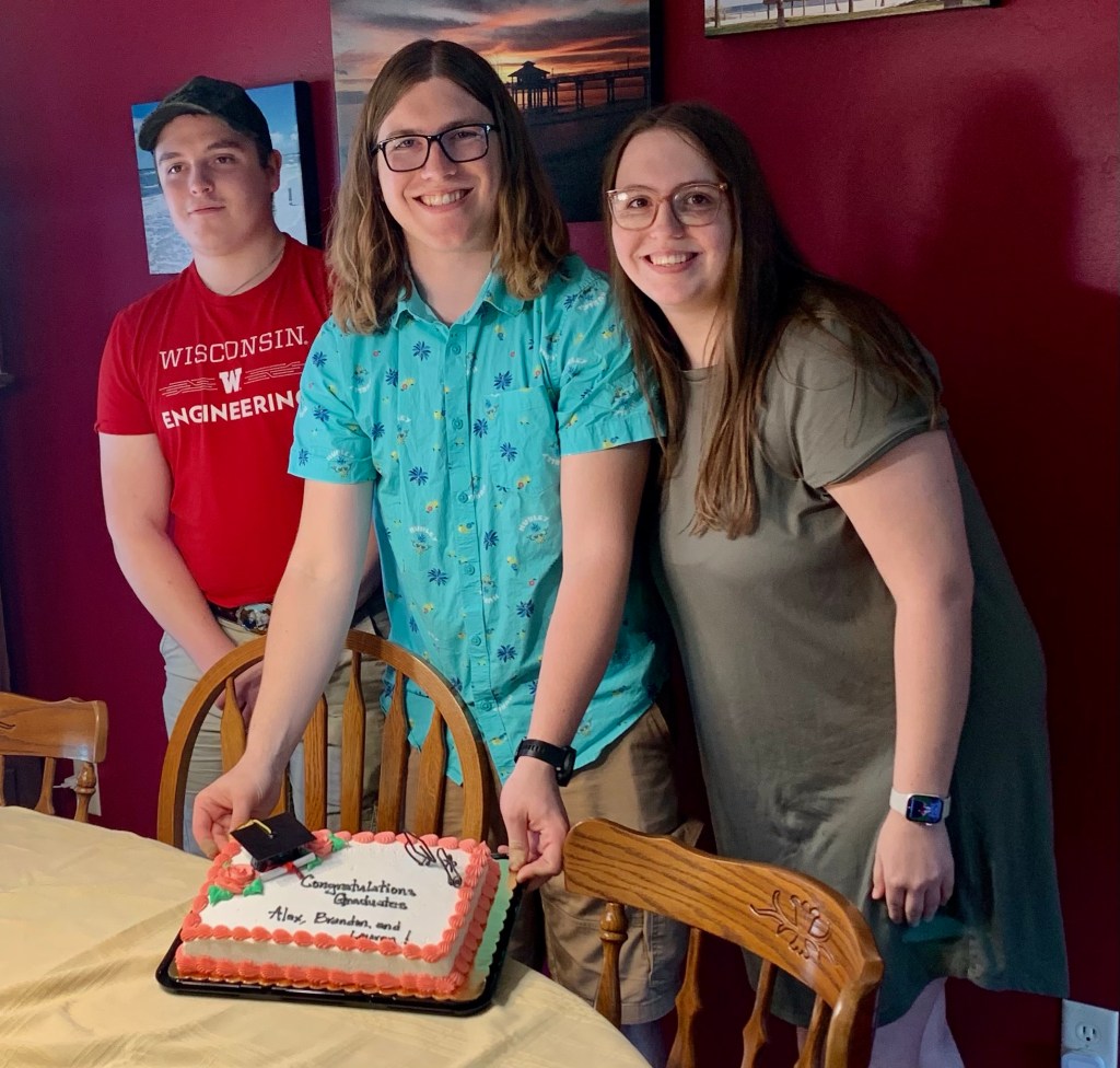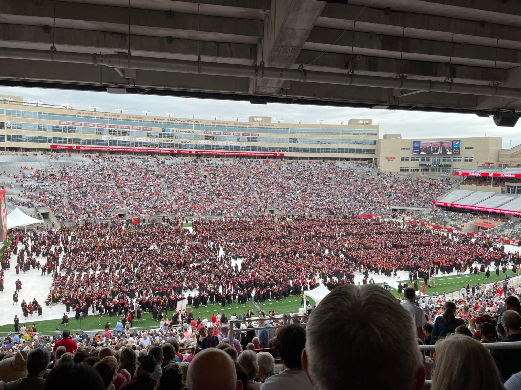 Before we knew it, it was Mother’s Day weekend – aka graduation weekend. Brad DID NOT want to navigate Madison traffic on graduation/move out weekend. We got a hotel room downtown within walking distance of Camp Randall Stadium. Alex had graduated High School with the smallest graduation class in a century, he was now part of the largest graduating class to date at UW Madison. There were nearly 8,000 graduates (bachelors, masters, and doctorates combined). Looking out at the field from the stands was like playing Where’s Waldo when EVERYONE is dressed like Waldo.