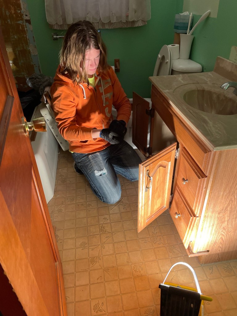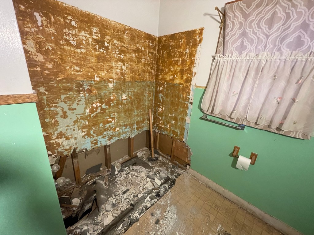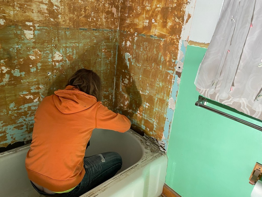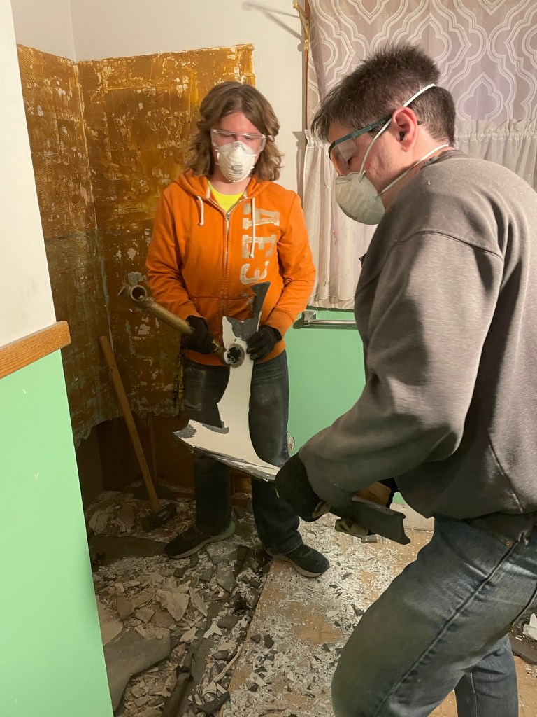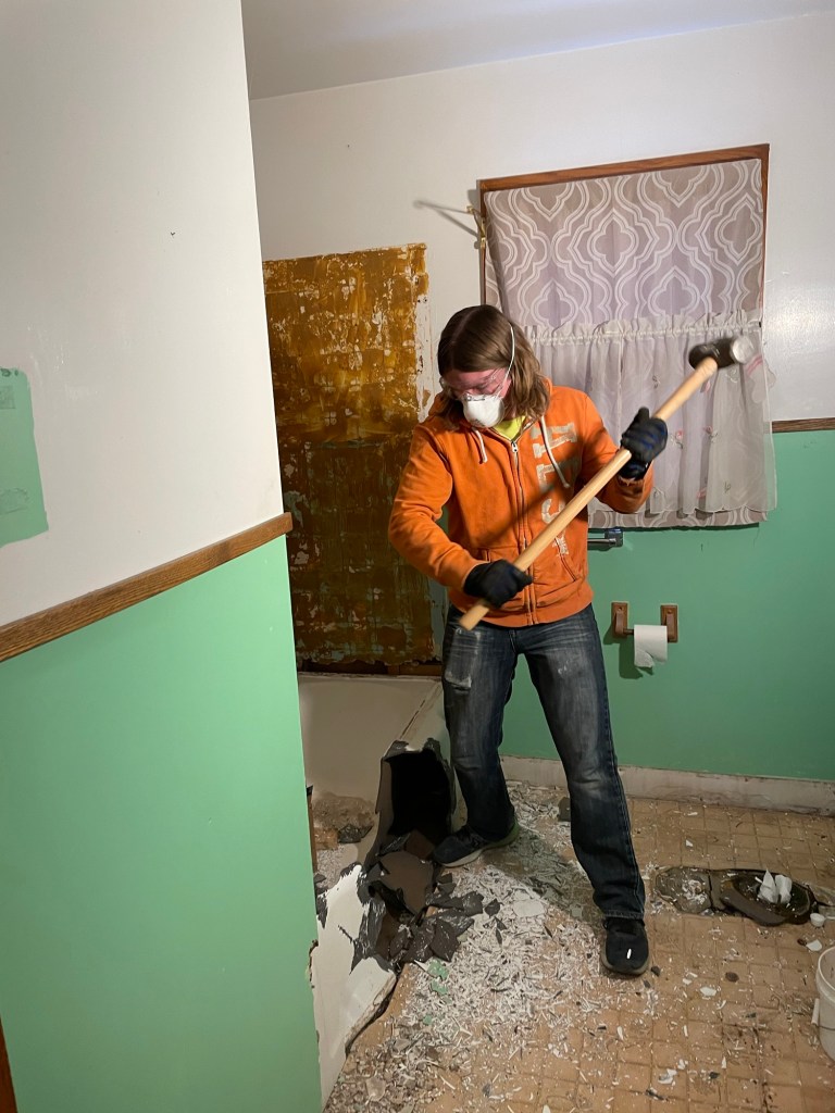 Our oldest was home for Christmas break and was helping Brad brainstorm on how to move the tub. Brad had a thought. Confirmed that we were quite sure it was cast iron, and he was certain that we would not be reusing it. He went and got the sledge hammer, and with a good swing cracked the tub. A few more swings (and ear protection) the tub left the house in pieces. Was this a waste, perhaps. It was not a vintage claw foot tub or anything noteworthy. We try our best to reuse when we can, and donate to Goodwill, St. Vincent de Paul, and the ReStore when we can. In all practicality, this was the only way (without more work than it was worth) to remove the tub.