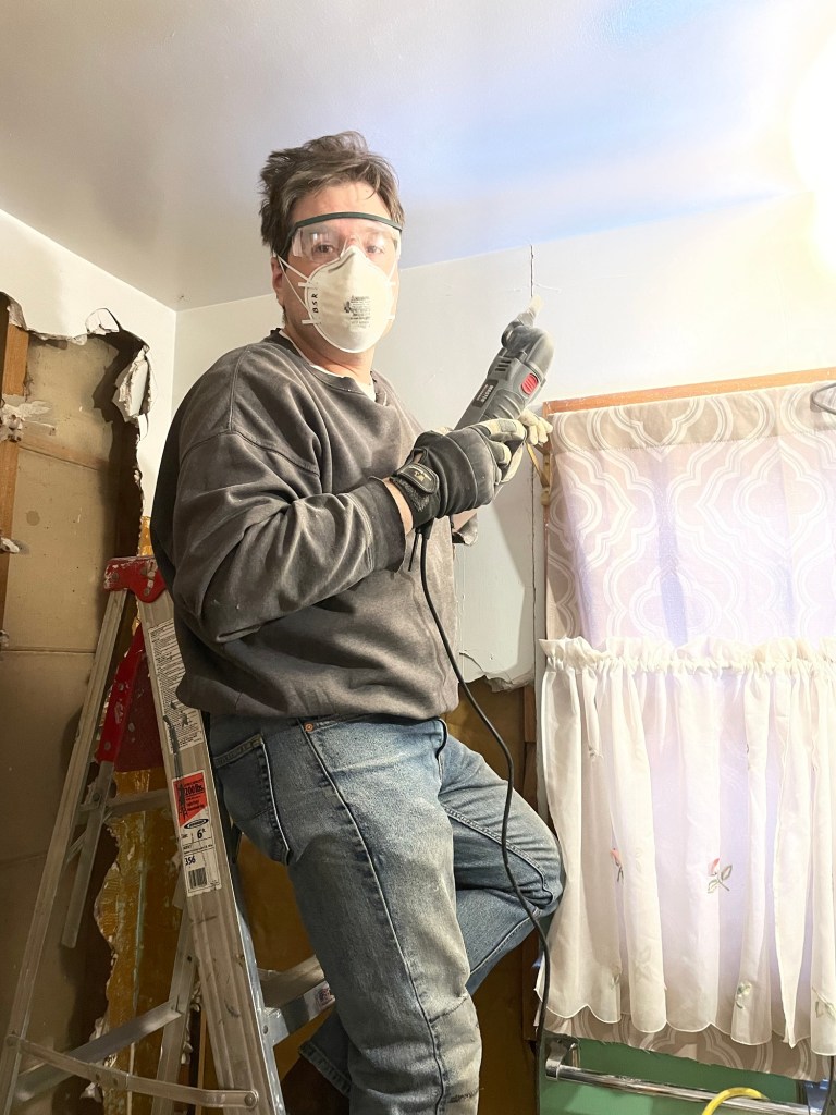 Once that was out – I first made Brad put a board over where the drain line had been. Last thing we needed was someone taking the fast route to the basement. Then we removed the plaster and rock lath from most of the walls. Brad used a oscillating tool (not reciprocating, that’s the Sawzall) with different attachments to cleanly cut the “lovely” plaster and rock lath where we were saving the plaster.