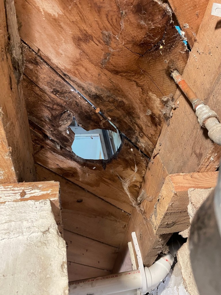 A major problem was the cast-iron pipe from the 2nd floor toilet. The plumber in 1955 apparently thought floor joists were overrated. Of the 8” joist 7” had been removed to make room for the elbow.